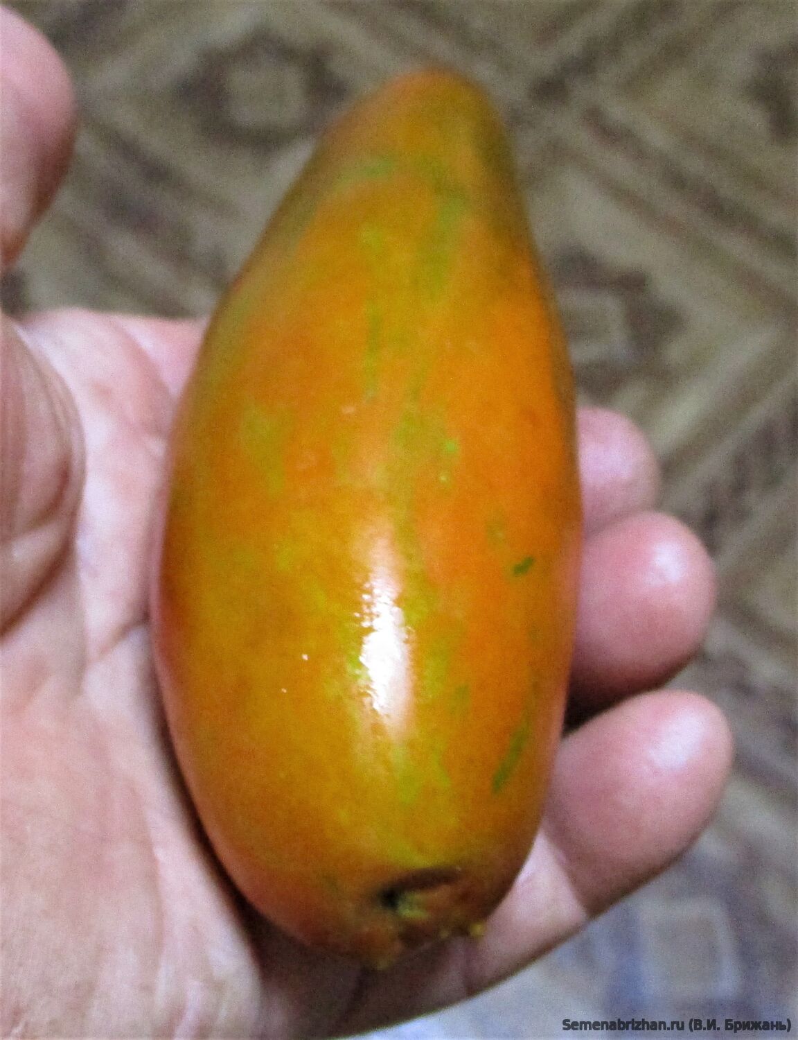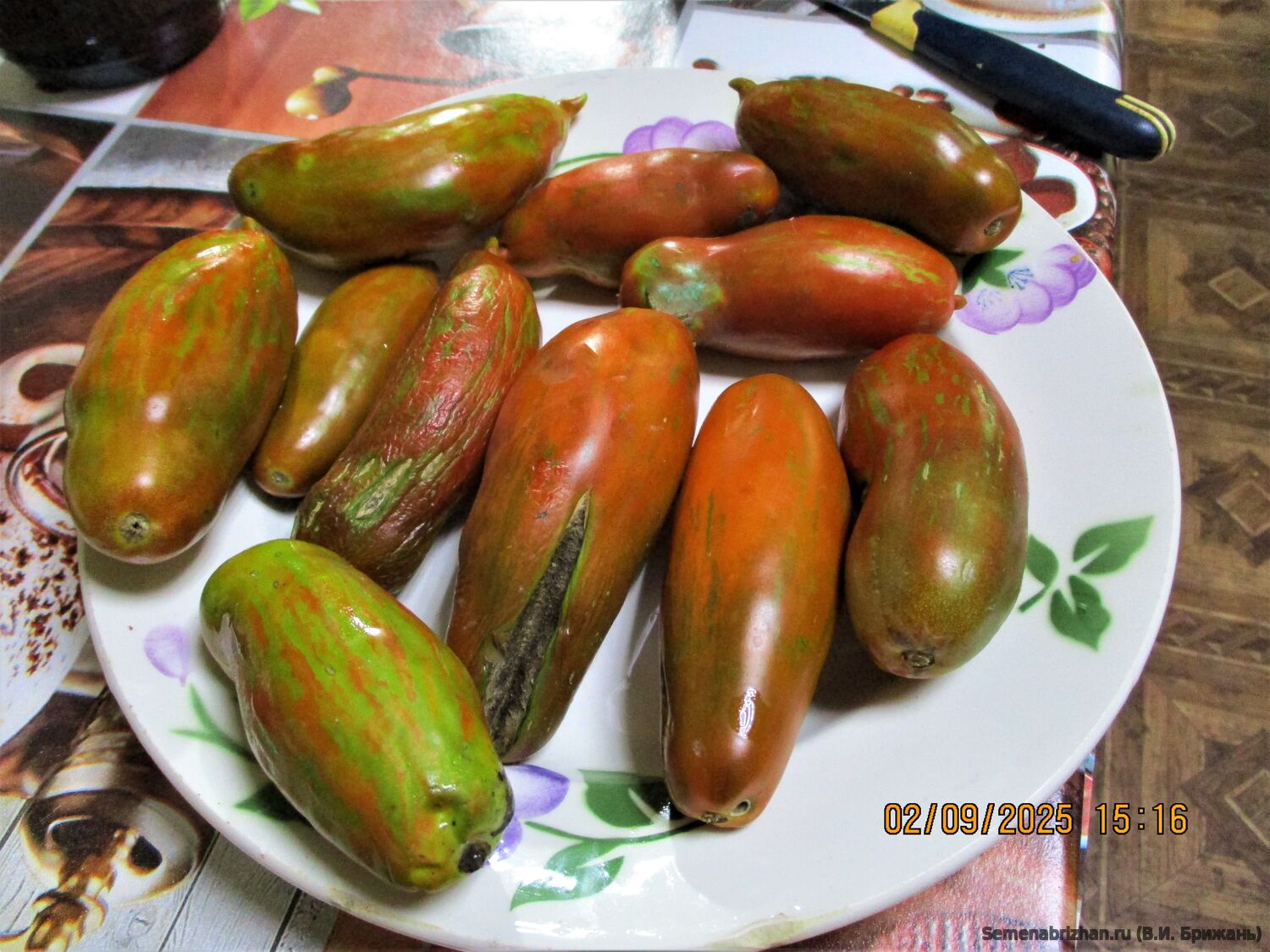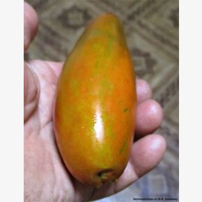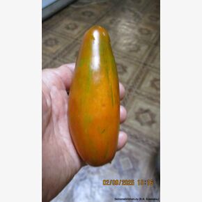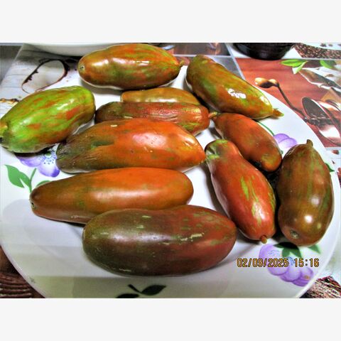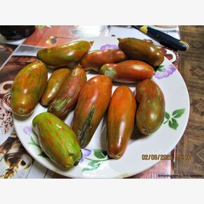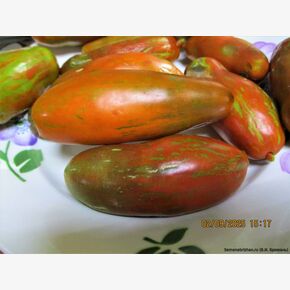 Томат «Мордовская Сосиска» — высокорослый (2 м+), среднеспелый коллекционный сорт Н.В. Жегалина с необычными удлиненными плодами-сливами (150–200 г) шоколадно-коричневого цвета с бронзовыми полосками. Ценится за сладкую, нежную, маслянистую мякоть, высоку