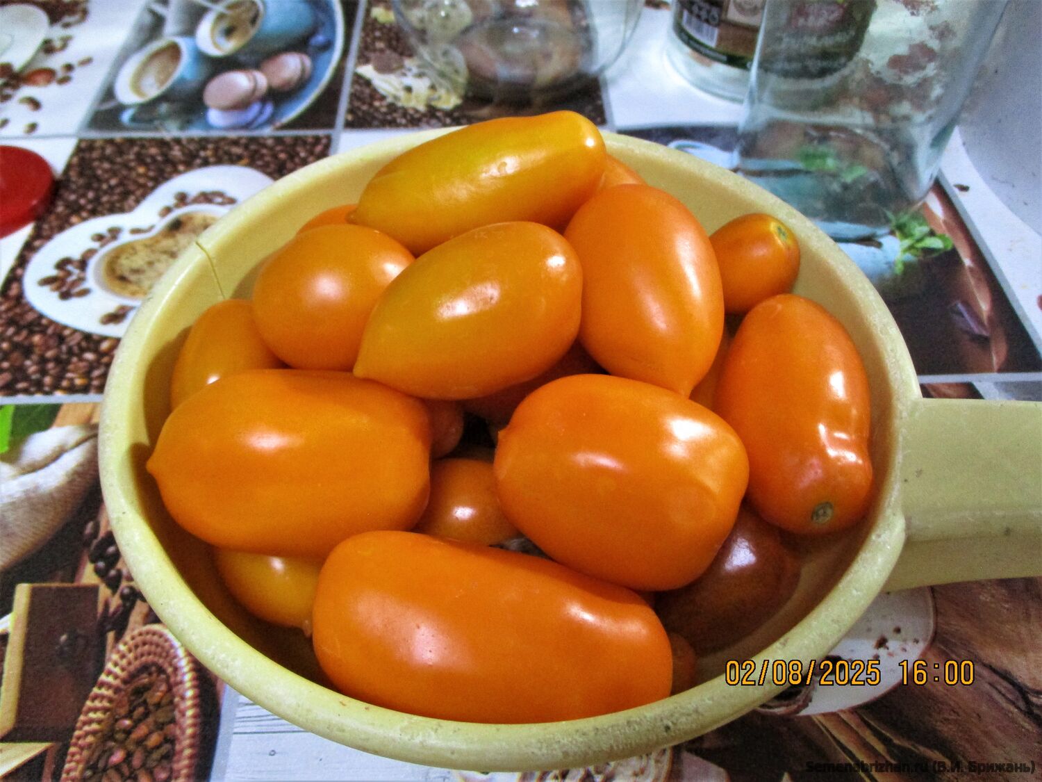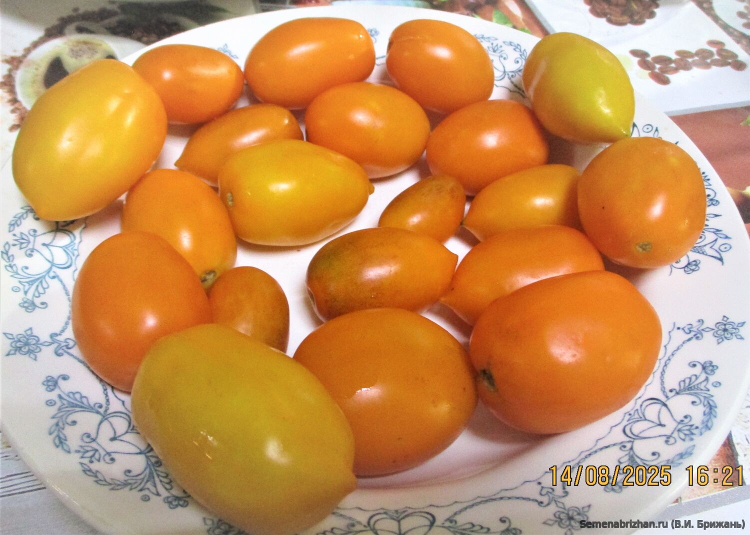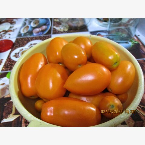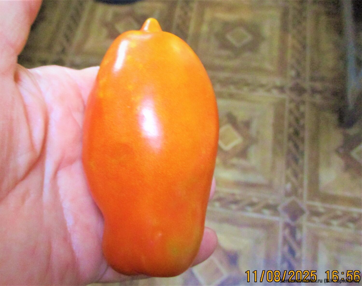 Томат Flaschentomaten Orange (Фляшентомат Оранжевый) — это индетерминантный среднеспелый коллекционный сорт немецкой селекции, представляющий собой оранжевую вариацию знаменитого сорта «Фляшен» – разновидность, полученная немецким селекционером В. Зонном от сортового гибрида первого поколения Corianne F1. Название происходит от нем. Flasche – «бутылочка» (плоды почти правильной цилиндрической, «бутылочной» формы). . Название переводится как «бутылочные томаты», что отражает специфическую вытянутую форму плодов. Срок созревания: среднеспелый (иногда классифицируется как среднеранний) -110-120дней, плодоношение длительное — с конца июля до самых заморозков. Основные характеристики: Тип куста: индетерминантный, высокорослый (до 1,8–2 метров). Характеристика куста: раскидистый. Стебель: тонкий. Листья: узкие. Растение требует обязательной подвязки и пасынкования; рекомендуется формировать в 2–3 стебля. Плоды: удлиненные «сливки» с характерным маленьким носиком («пимпочкой»). Цвет: ярко-оранжевый в биологической спелости. Масса: от 50 до 120 граммов. Вкус: Они сладкие, сочные и очень вкусные, плотные, мясистые, с малым количеством семян. Урожайность: высокая. Плоды собраны в крупные красивые кисти по 6–8 (иногда до 10-15) штук. Особенности выращивания и устойчивость Устойчивость: сорт отличается хорошей сопротивляемостью к фитофторозу и вершинной гнили. Плоды не склонны к растрескиванию и осыпанию с куста. Урожайность конечно не такая как у Фляшен с красными плодами, но тоже довольно приличная. Применение: благодаря плотной кожице и высокому содержанию сухих веществ, сорт считается идеальным для вяления и цельноплодного консервирования. Помидоры имеют идеальную форму и плотность для цельноплодного соления и консервирования. Также отлично подходит для употребления в свежем виде из-за десертного вкуса. Место выращивания: подходит как для теплиц, так и для открытого грунта (в южных регионах). В пакете 20 шт. семян.