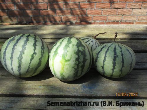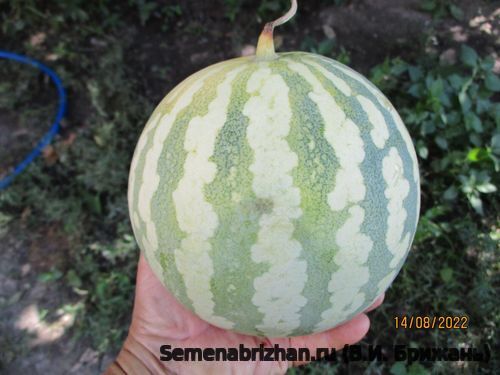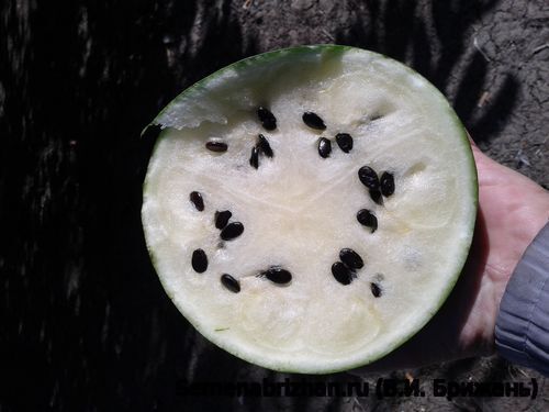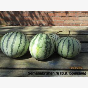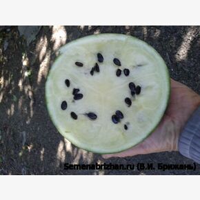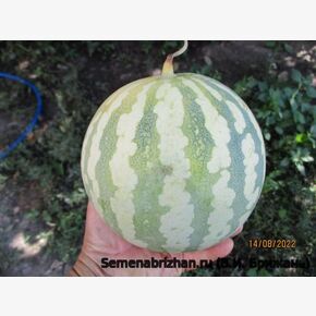Коллекционная реликвия из Средиземноморского региона. Вид известен особенно нежным вкусом и ароматом, созревает быстро - всего за 2 месяца (63 — 71 день). Растение среднеплетистое, длина главной плети менее 2-х метров. Плети короткие, но обильно плодоносящие. Стебель с редким опушением. Завязь шаровидная с редким опушением.Плоды небольшие круглые, вызревают быстро, поэтому сорт подходит для выращивания в Средней полосе. Кора тонкая, гладкая, бледно-зелёная с тёмно-зелёными полосами. Плодовая мякоть белая, очень вкусная, с плотной структурой, чудесным ароматом и очень сладкая. Можно выращивать вертикально. Урожайный. Плоды сохраняются до 30 дней. Транспортабельность хорошая. Плоды содержат 10,0-11,0 % сухих веществ, 8,0-9,5 % сахаров, 9,0-10,0 мг% витамина С. Семена мелкие (длина 7,8-8,0 мм, ширина 4,0-5,0 мм), черного цвета, гладкие. Сорт прекрасно себя чувствует на почвах Сибири, морозоустойчив, но редко встречается на прилавках магазинов даже в разгар сезона. Развитие саженцев медленное, поэтому опытные огородники рекомендуют проводить посев в обычные пластиковые горшки с питательным грунтом за месяц до предполагаемой высадки на открытую местность. Отличительной чертой данного сорта является дружная отдача урожая. Сорт устойчив к заболеваниям, с хорошими транспортабельными качествами. Для засолки и потребления свежим. Назначение – рекомендуется для употребления «с грядки», приготовления сочных цукатов и лечебного арбузного меда, для засолки и маринования. Этот арбуз ценится садоводами за необычный светлый вид коры и классический «сахарный» вкус мякоти, напоминающий десерт. Способность завязывать плоды даже при низких температурах и в условиях недостатка освещения. Совершенно неприхотлив. Очень ранний сорт с высоким содержанием сахаров.Сохраняет свой превосходный вкус и спелую текстуру в течение длительного времени после срезки (через 100 дней после всходов). Предназначен для выращивания в пленочных теплицах и в открытом грунте.Сорт относительно засухоустойчив, слабо восприимчив к мучнистой росе, антракнозу и фузариозу, отлично подходит для холодных мест. Сорт считается неприхотливым, адаптированным к непростым погодным условиям. В пакете 5 шт. семян.