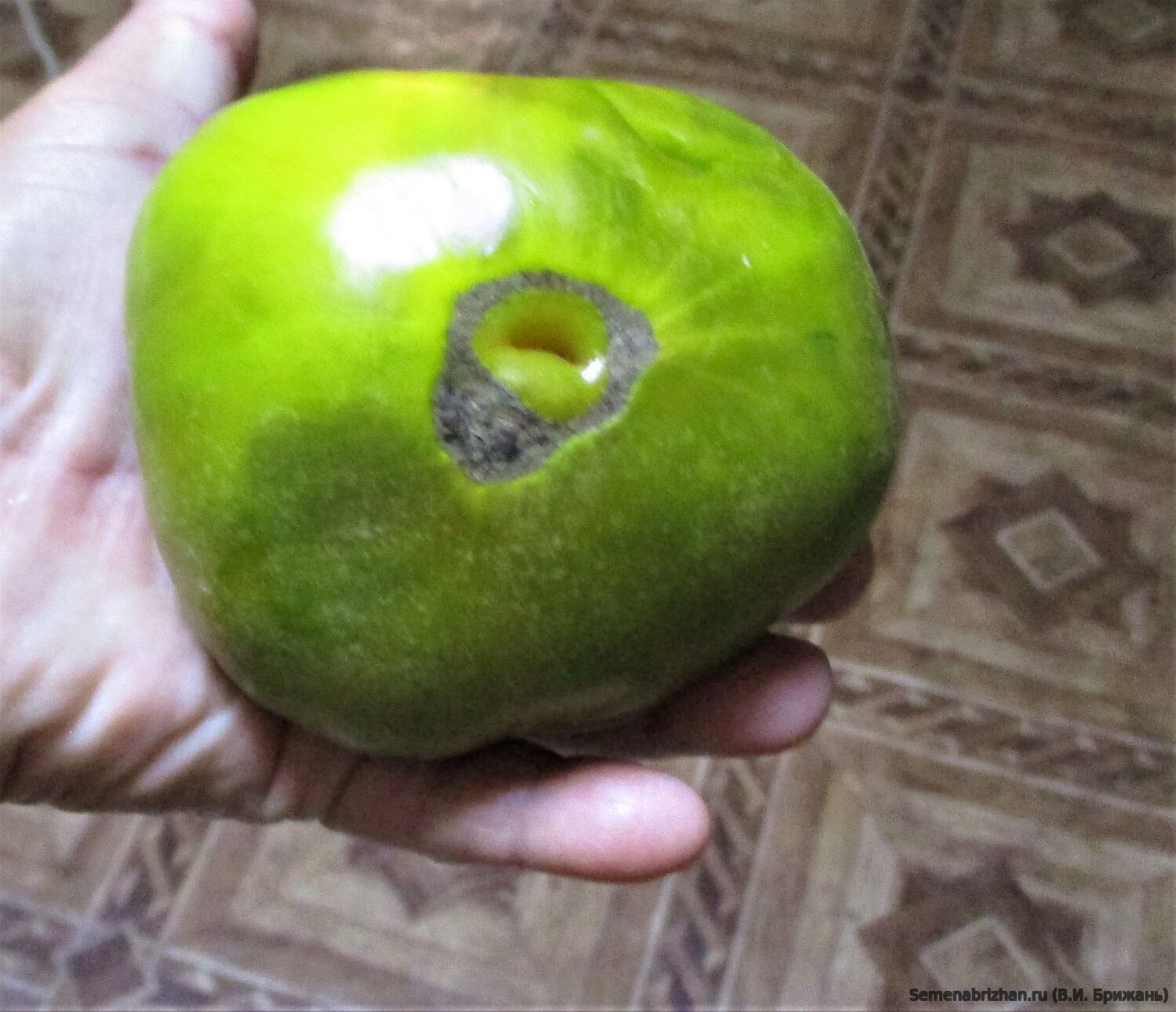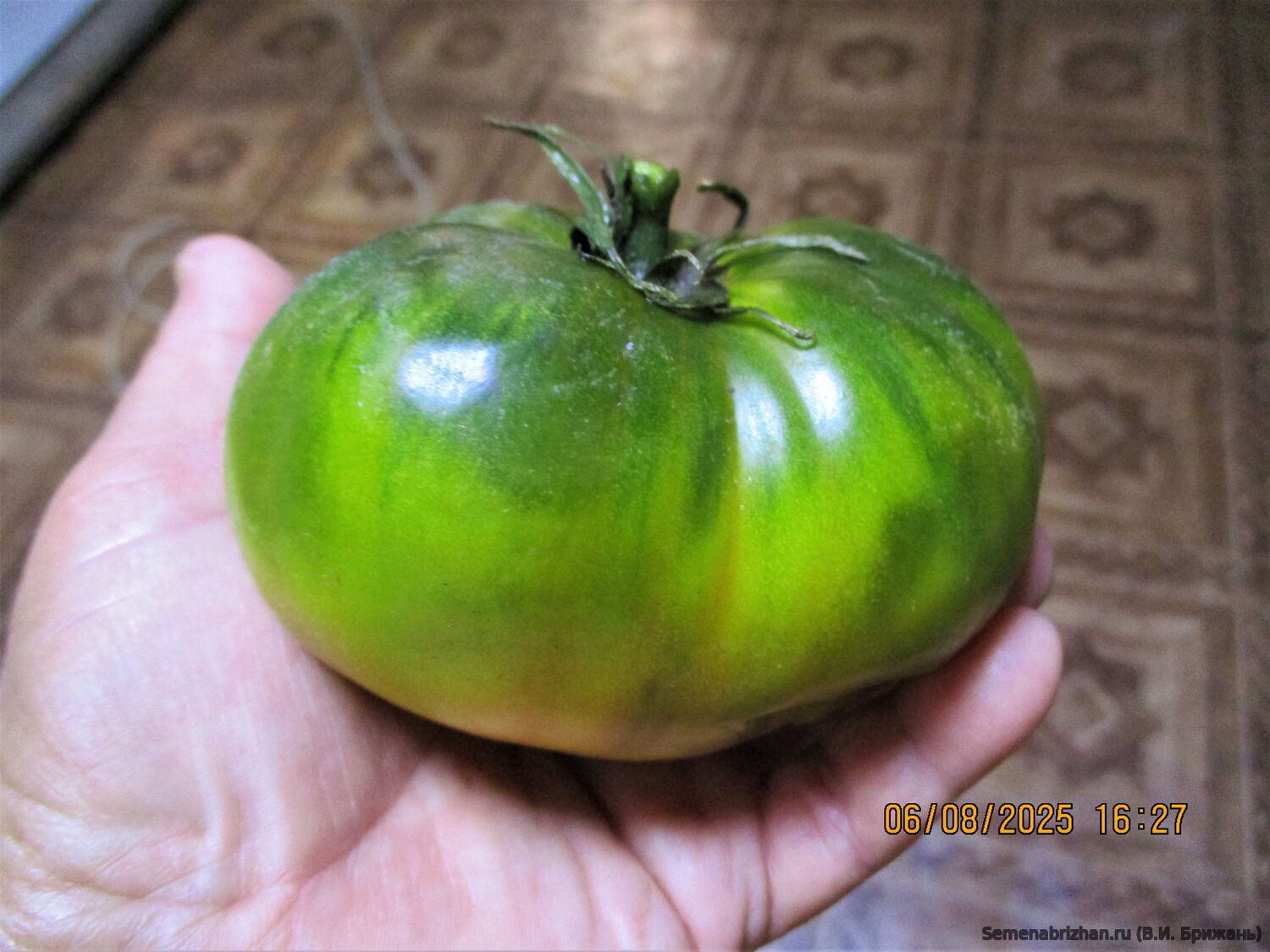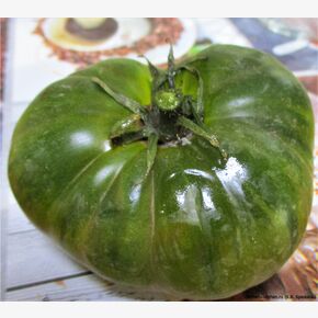 Томат Big Green Dwarf (Большой зеленый гном) — среднеспелый, детерминантный сорт из серии Dwarf Tomato Project. Сорт получен в 2014 году в рамках проекта Dwarf Tomato Project от скрещивания Golden Dwarf Champion и Cherokee Chocolate. Не путать с сортом New Big Dwarf, который имеет плоды малинового цвета. Компактные кусты (до 1 м) дают крупные зелено-янтарные плоды (150–250 г) с изумрудной, сладкой, десертной мякотью. Урожайный, устойчив к болезням, не требует обязательного пасынкования, подходит для теплиц и открытого грунта. Основные характеристики сорта: Тип растения: Детерминантный (низкорослый), штамбовый. Высота в теплице до 1.2 м, в открытом грунте около 80-100 см. Сроки созревания: Среднеспелый, начинает плодоносить через 70-80 дней после высадки рассады. Форма и цвет плодов: Плоды плоскоокруглые, гладкие. При созревании меняют цвет с травянисто-зеленого на оливково-желтый или янтарный. Вкус и мякоть: Мякоть изумрудная, мясистая, сочная. Вкус очень сладкий, с фруктовыми нотками. Урожайность: Высокая. Плодоносит до заморозков. Особенности выращивания: Не требует обязательного пасынкования, достаточно подвязки. Можно выращивать в контейнерах от 10 литров. Назначение: Идеальны для свежего употребления, салатов, приготовления экзотических зеленых соусов. В пакете 5 шт. семян.
