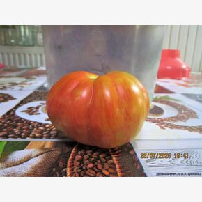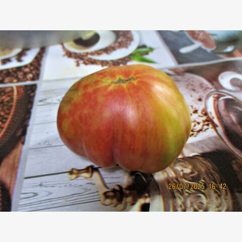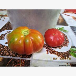 Томат Rebel Starfighter Kayleigh Anne Pink («Восставший Звездный Истребитель Кэйли Энн Пинк») — экзотический, коллекционный и пока ещё редкий, индетерминантный (высокорослый) среднеранний сорт селекции Рассела Кроу (США). Уникальность: Сорт получен от скрещивания Snow White Cherry и Rebel Starfighter Prime. Поскольку сорт относительно новый, он может демонстрировать расщепление — небольшие различия в форме плодов. Сорт отличается красивым видом на кусте и превосходным сладким вкусом, являясь достойным продолжением серии «Звездных Истребителей. Ценится за нарядные розовые плоды с золотистыми полосками, сладкий вкус с фруктовыми нотками и высокую урожайность. Подходит для теплиц и открытого грунта. Основные характеристики: Куст: Индетерминантный, высотой от 1,5 до 2 метров и более. Требует обязательной подвязки и пасынковании (обычно формируют в 2-3 стебля). Плоды: Среднего размера, плоско-округлой или сердцевидной формы. Цвет и вкус: В зрелом виде плоды малиново-розовые с золотистыми штрихами и полосами, иногда с антоциановым напылением. Мякоть сочная, сладкая, с выраженным карамельным или фруктовым вкусом. Вес: Обычно 50–150 грамм, встречаются экземпляры до 300–450 грамм. Урожайность: Высокая, плодоношение длительное. Устойчивость: Высокая устойчивость к основным болезням томатов. Особенности выращивания и использования: Срок созревания: Среднеранний (около 85–95 дней от высадки рассады). Применение: Универсален — отлично подходит для свежих салатов,, украшения блюд, для засолки, соусов, а также благодаря плотной кожице, для цельноплодного консервирования, не растрескивается, оригинально смотрится в банках. Очень красивый и вкусный закусочный помидор. Сбалансированный вкус с пряными нотками.В пакете 5 шт. семян.