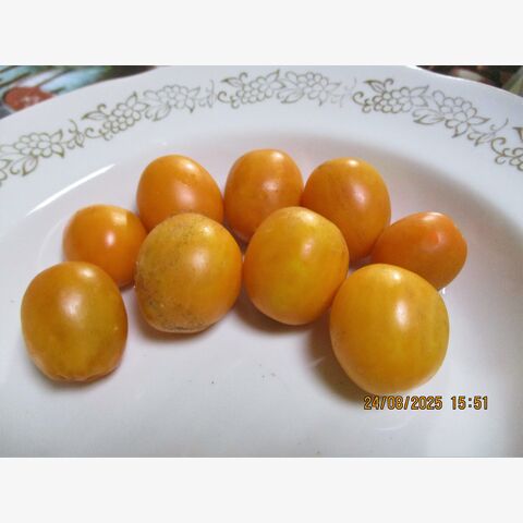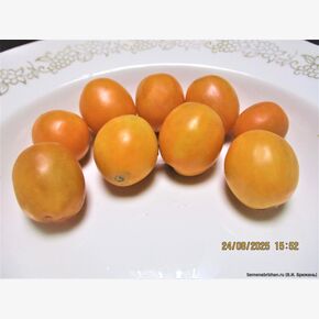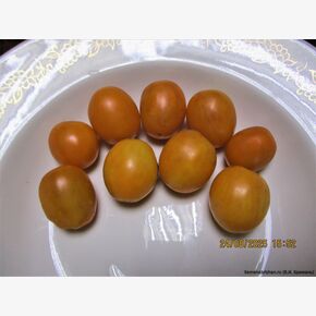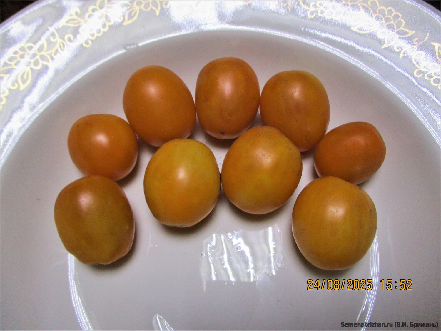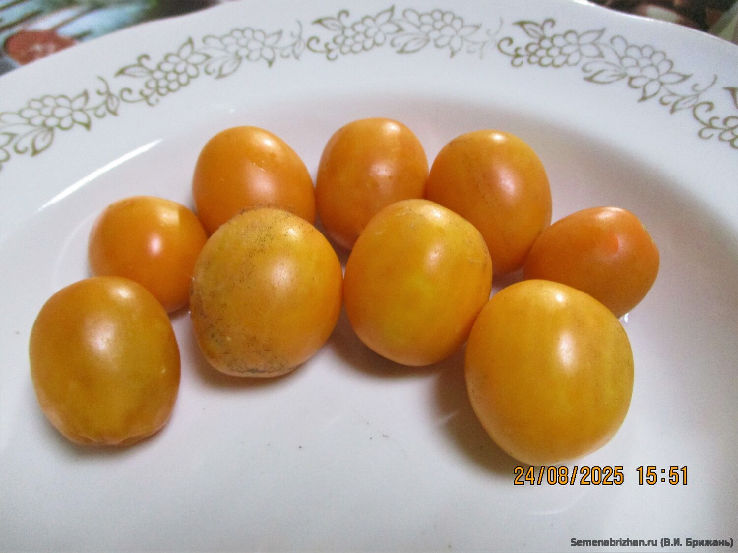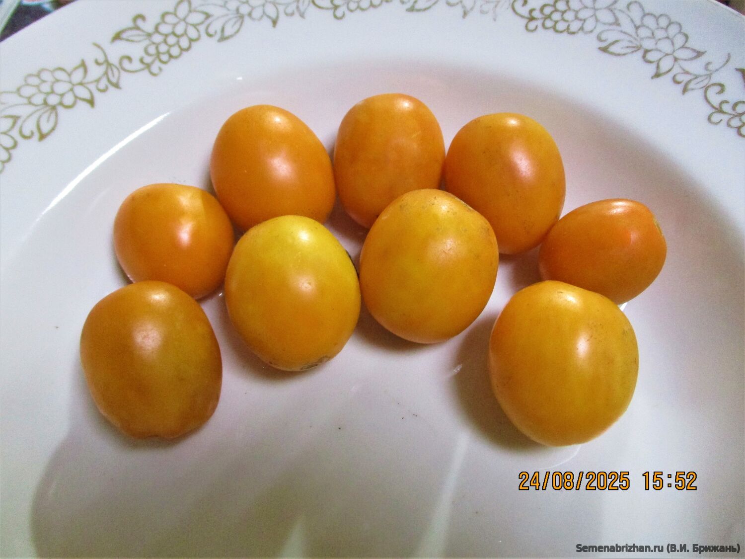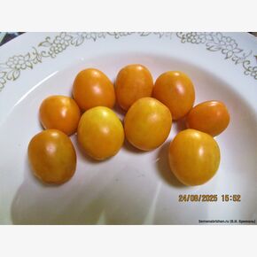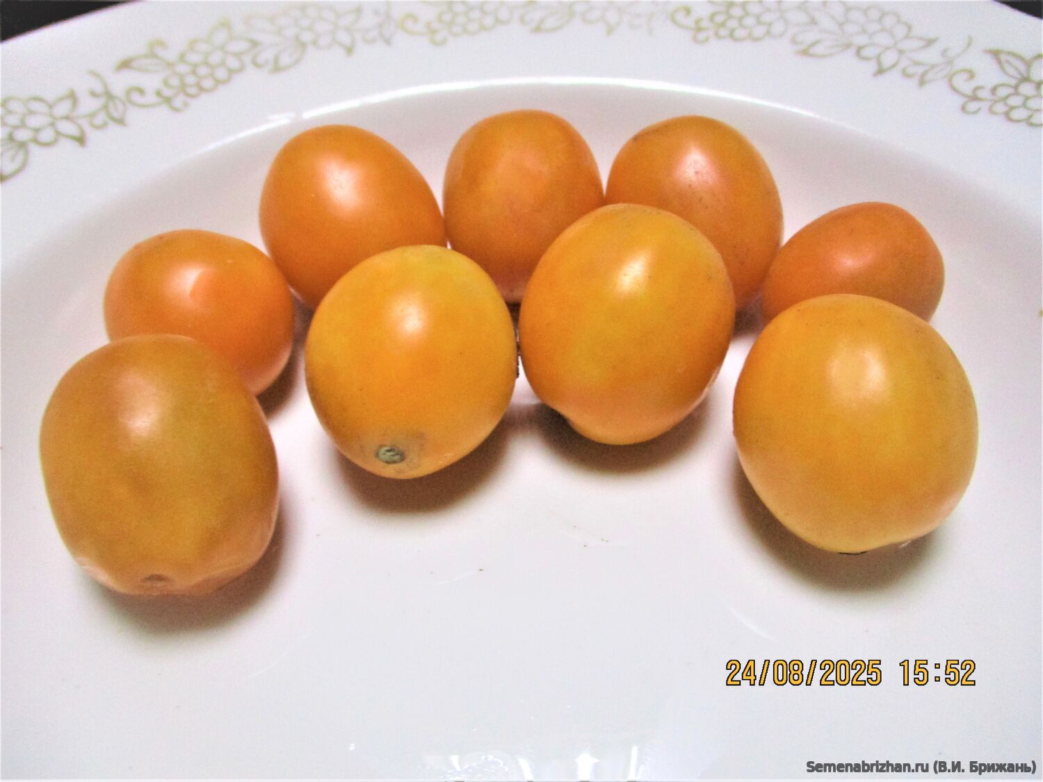 Фамильный, коллекционный сорт из Подмосковья, выращивается с 1990х годов. Сорт высокорослый, индетерминантный, среднеспелый. Куст мощный, можно вести в 3 стебля. Кисти сложные, в кистях до 10 плодов, помидорки в них поспевают неравномерно, при этом держатся крепко, не опадают, что позволяет при необходимости дождаться полного созревания всей кисти, а уже перезревшие помидоры могут осыпаться, но у него прекрасная завязываемость в затененных местах и он засухоустойчив. Сорт относительно трещиноустойчив. Кожица средней толщины, мякоть медово-жёлтая, плотная, хорошо держит форму, очень сладкая!!! Сорт с потрясающей урожайностью и удивительно сладкими плодами-сливками желточно-медово-жёлтого цвета. В многочисленных сложных кистях завязывается до 50 плодов, средней массой 25-30г. Они плотные, отлично ведут себя при цельноплодном консервировании, не расползаются при нарезке. Очень яркий сладкий вкус не оставит равнодушными даже гурманов! Любимец детей: они набивают карманы помидорками и лакомятся ими на прогулке! Использование: Универсальное — идеальны для салатов, украшения блюд, для заморозки, для засолки, отлично подходят для цельноплодного консервирования благодаря плотной кожице, не растрескивается, оригинально смотрится в банках. Очень красивый и вкусный закусочный помидор. Устойчивость: Сорт неприхотлив, отличается хорошей устойчивостью к болезням. Он ценится за стабильное плодоношение и отличные вкусовые качества. В пакете 5 шт. семян.