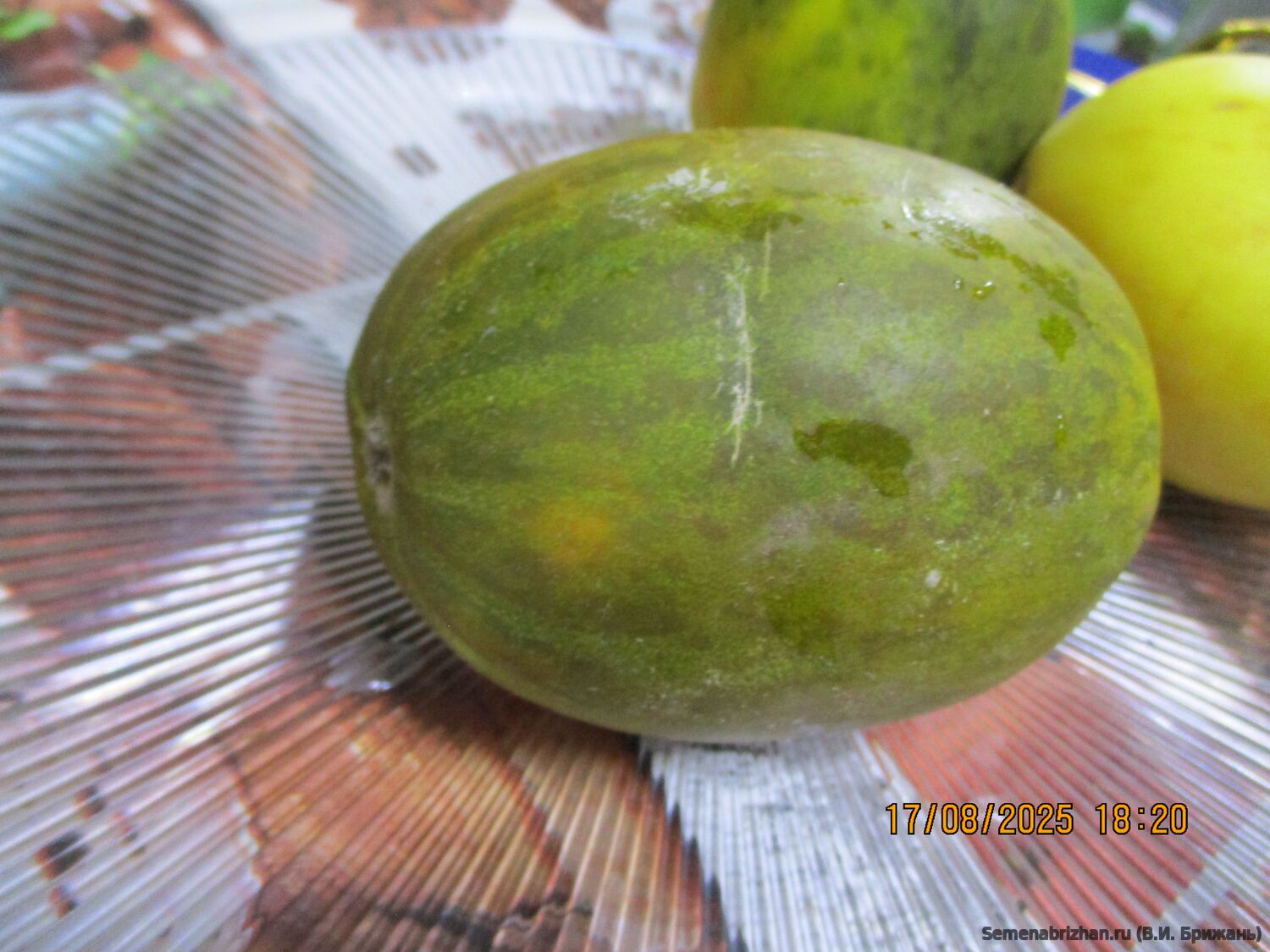 Мелкоплодная сахароносная дыня (Cucumis melo var. Saccharinus). Уникальный коллекционный, редкий, ультра-ранний (плоды начинают созревать через 35–45 дней после всходов), декоративно-съедобный сорт. Исключительно интересное растение для зон северного садоводства, что позволяет выращивать их даже в открытом грунте. Уникальная дыня, которая не боится похолоданий, а также обильных осадков во время созревания плодов. Можно собирать примерно через 27 дней после цветения. Плоды: Маленькие, овальной формы. Окраска — в технической спелости зелёная с тёмными полосками и крапинками, при полной спелости становиться ярко-жёлтая с выраженными коричнево-желтыми продольными полосами, напоминающая крошечные арбузы. Полосатая сладкая дыня, высокая устойчивость к болезням, плодоносит и на основной и на побочных лозах. Приятный внешний вид, светло-зеленая или кремовая, очень сочная, маслянистая мякоть, с ярким ананасным ароматом, на вкус очень хорошая, хрустящая, с приятным запахом. Содержание сахара в центре составляет около 18%. Вес около 500 гр. Урожайность: Высокая. Одно растение приносит 20–30 (в южных регионах до 40) мини-дынек за сезон. Устойчивость: Отлично переносит резкие перепады температур и высокую влажность. Устойчива к болезням и вредителям. Внешний вид: Плоды выглядят нарядно, кожица тонкая. По мере созревания запах становится очень интенсивным. Небольшие, размером с крупное яблоко или небольшую грушу, полосатые плоды. Цвет: Желто-коричневый. Вкус и использование: Дыня обладает деликатесным вкусом с приятной кислинкой, несмотря на высокую сладость. Из-за мелкого размера их удобно есть, разрезав пополам. В мякоти содержится богатый набор полезных микроэлементов и витаминов. Очень вкусная в свежем виде, а также в варенье, в повидле, джемах, настойках и даже в вине.Особенности выращивания: Рассада: Высаживают 3-4-недельную рассаду в начале июня. Формировка: В открытом грунте главную плеть прищипывают над 3-4 листом, оставляя 2 развитых боковых побега. Условия:Любит богатые перегноем земли. Можно выращивать на шпалере, так как плети длинные, а плоды маленькие. Уборка: Плоды собирают по мере созревания, они легко отделяются от плодоножки, когда поспеют. *Форма плодов может меняться в зависимости от условий. В пакете 5 шт. семян.