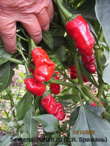 c. chinense. Сорт острого перца из Бразилии. Растение компактное, высотой до 50 см Урожайность очень высокая. Стручки небольшие, в биологической зрелости белые, потом через оранжевый перецветают в красный. Отличные вкусовые качества. Аромат тропических...
